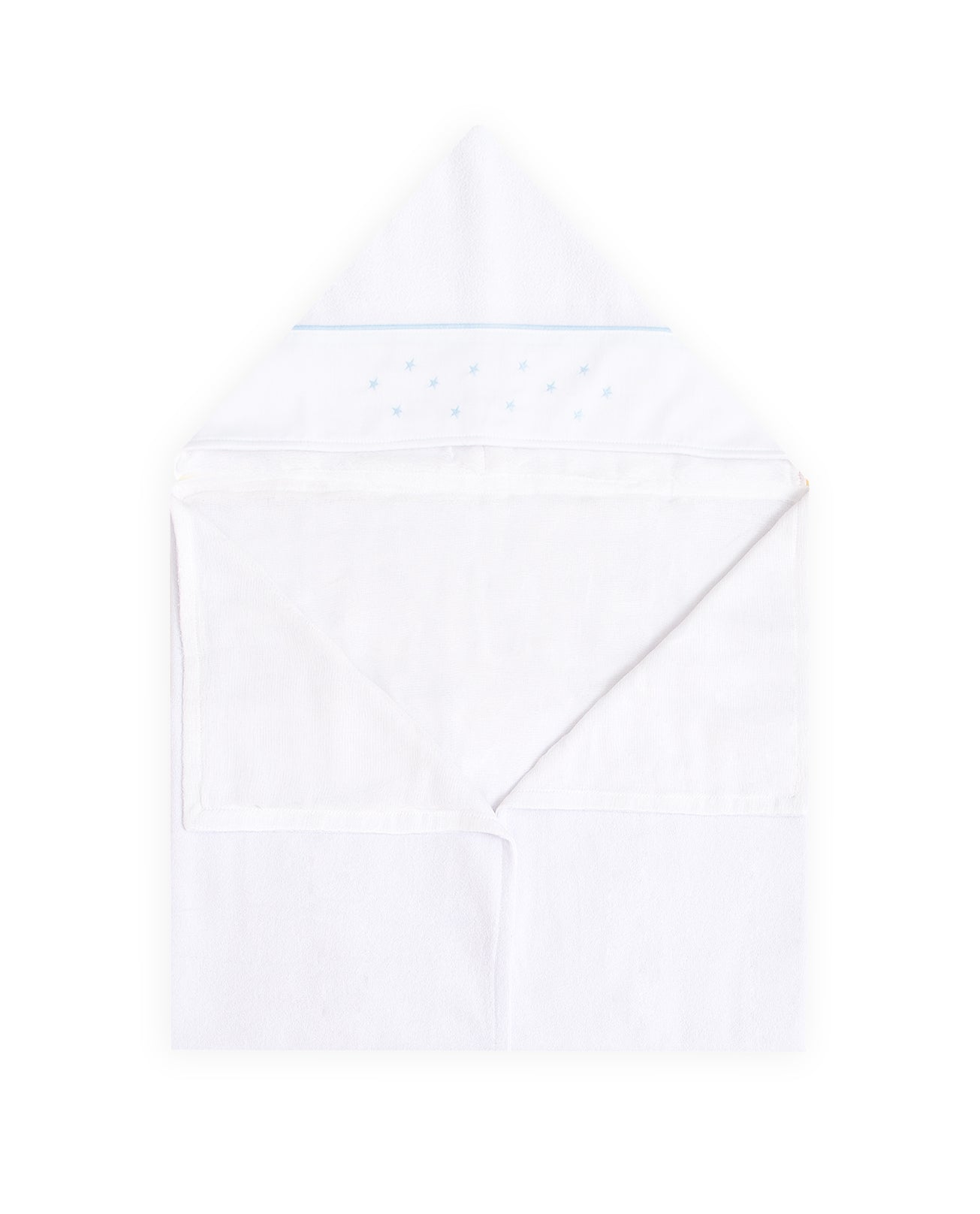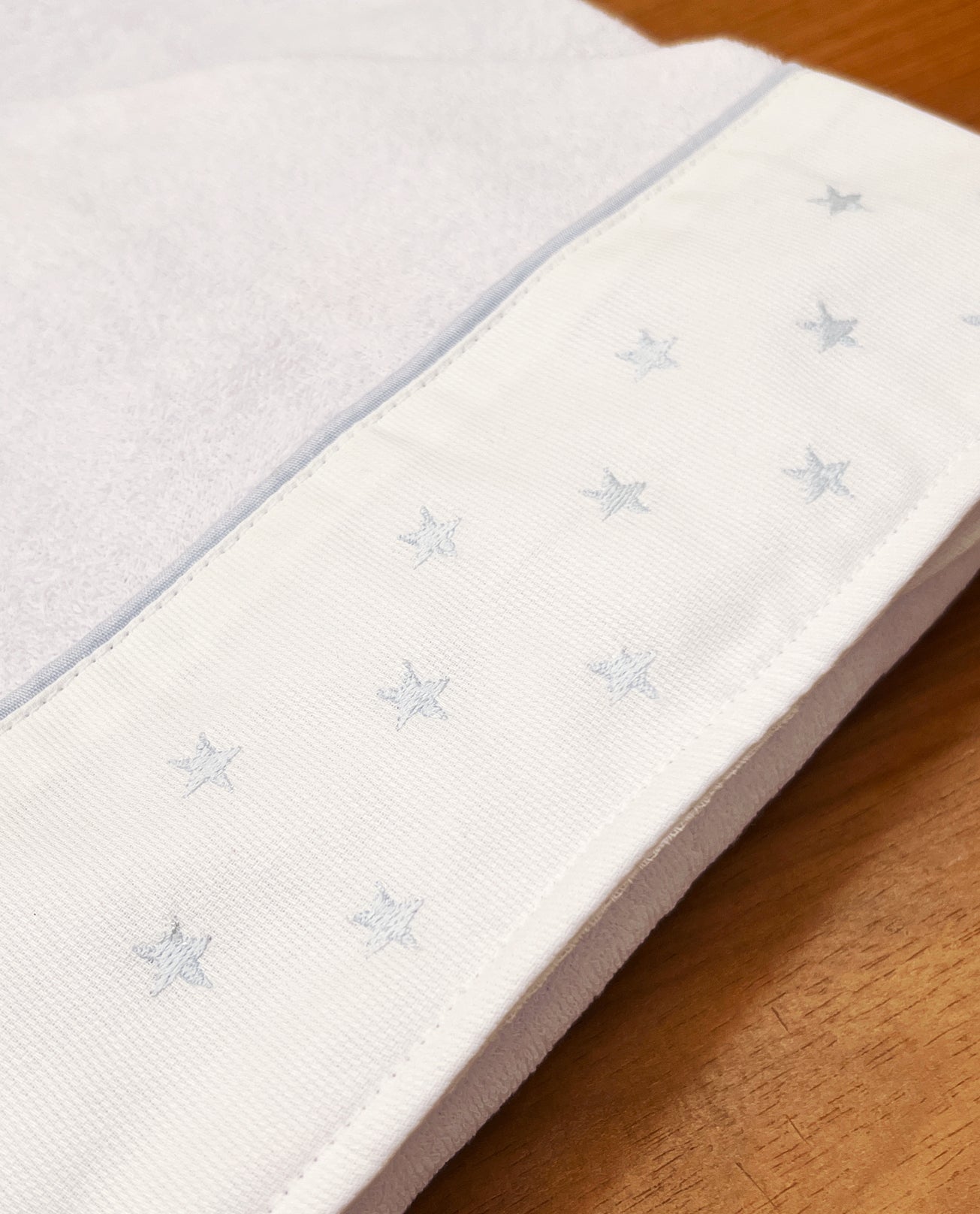 Toalha para bebês com touca bordada com mini estrelas azuis em felpinha forrada com camada dupla de fralda premium para garantir total absorção de forma delicada para não irritar a pele do bebê.
